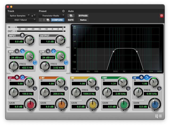 EQ3 7-Band affords you extensive control over your sounds in the mixing phase. “7-Band” refers to the individual controls you have by frequency range, though you can instead pick from dozens of presets created for specific instruments or use cases, like the quirky Transistor Radio setting.